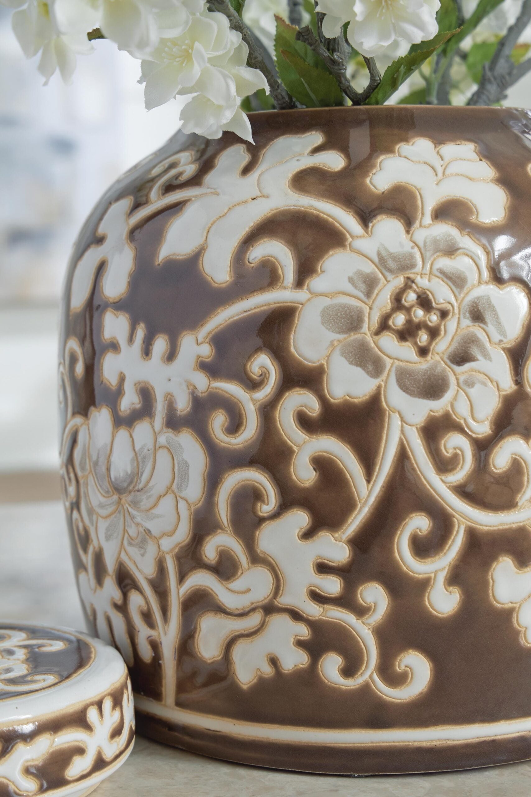 Evoke the feeling of a treasured heirloom with this exquisite jar. The warm palette and delicate floral pattern add a layer of curated worldly style to your favorite spot. Let it stand alone as a sophisticated art piece on your mantel, or fill it with a few fresh stems to bring a touch of life to your room.