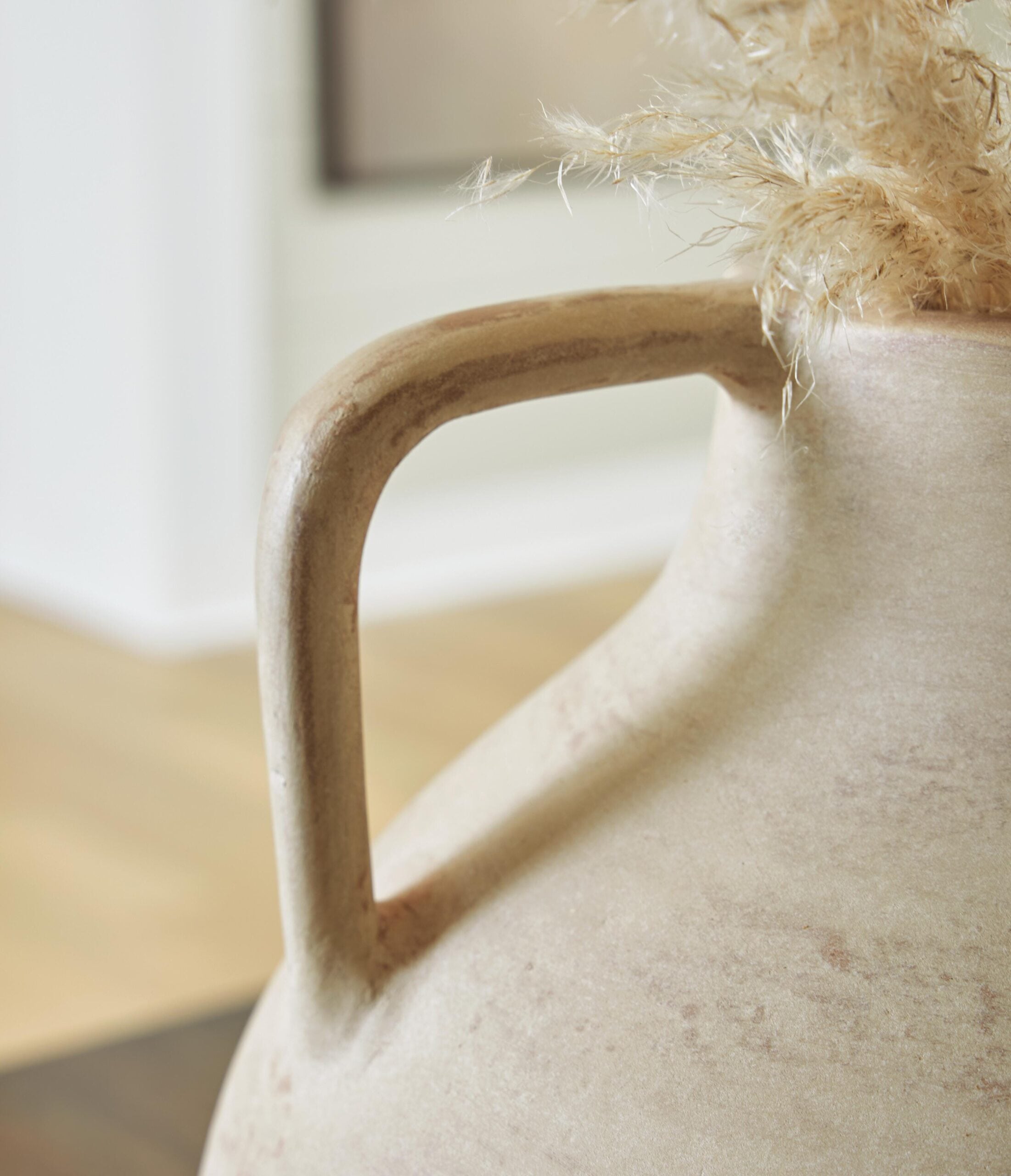 Crafted with care, this vase recalls the beauty of found artifacts. Its terra cotta construction and antiqued beige coloration lend a classic look and feel to the shapely silhouette. Slight differences in finish highlight the character and charm of each individual piece.