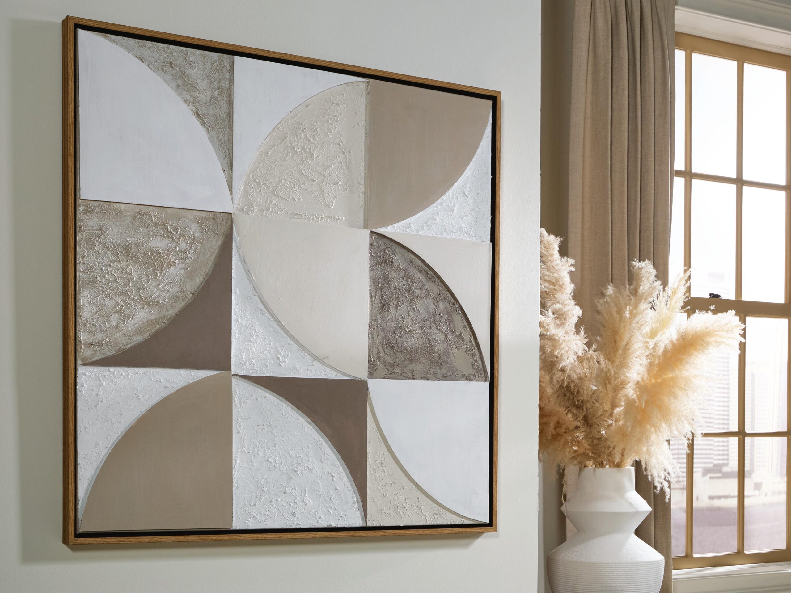 Make a bold geometric statement with this wall art. Its hand painted design balances curves and angles in soothing neutral tones, creating a captivating sense of movement and depth. Expertly finished with a light brown frame and four-way hanging versatility, this contemporary piece brings gallery-worthy style to your home.