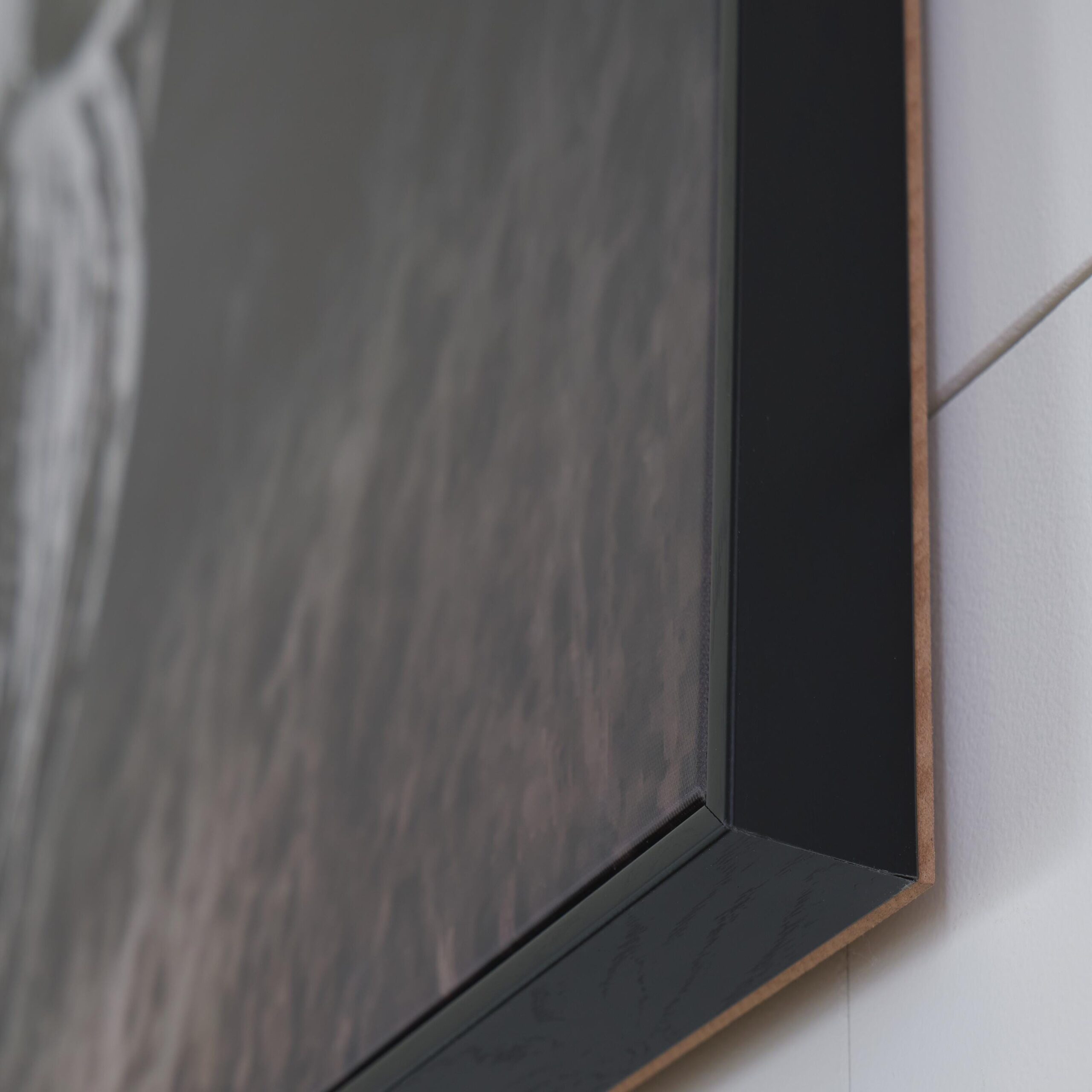 Add homespun charm to modern farmhouse and casual spaces. A longhorn cow takes center stage in this wall art, its white coat contrasting beautifully against the dark background tones. A sleek black frame completes the look.