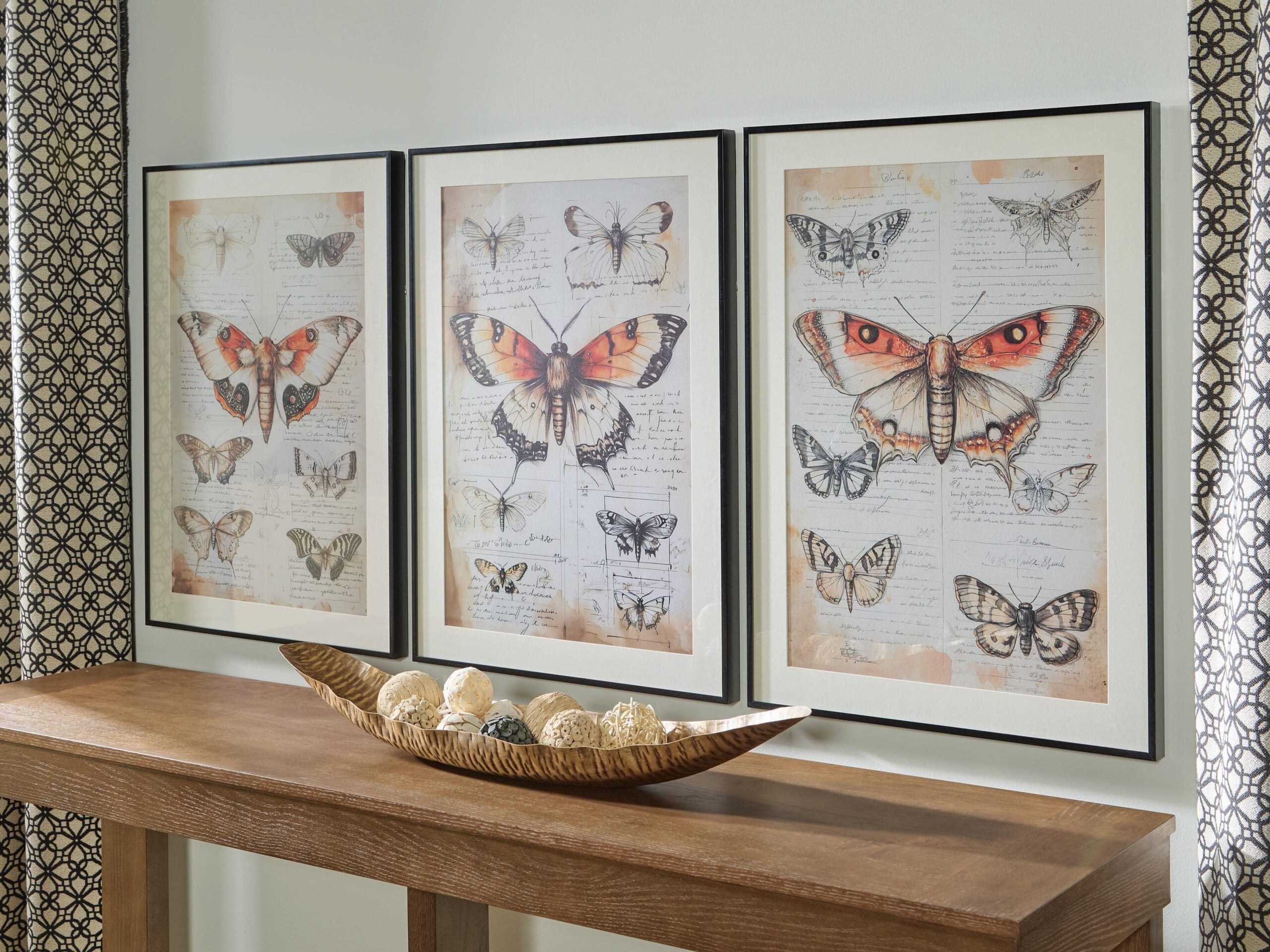 Grace your walls with vintage charm. This exquisite wall art set features intricate butterfly prints floating over a backdrop of antique script, creating a timeless and elegant look. Sleek black frames add subtle sophistication to this trio.