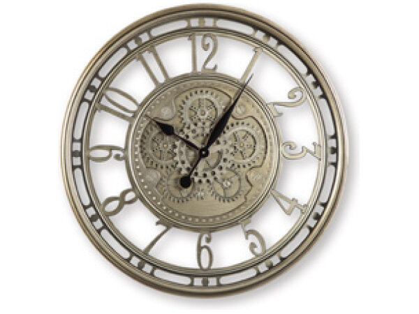 | Series Features | Black and gold finished metal wall clock with moving gears. Clear glass face. Roman numerals. Keyhole bracket for hanging. Operates with 3 AA batteries (batteries not included). |
