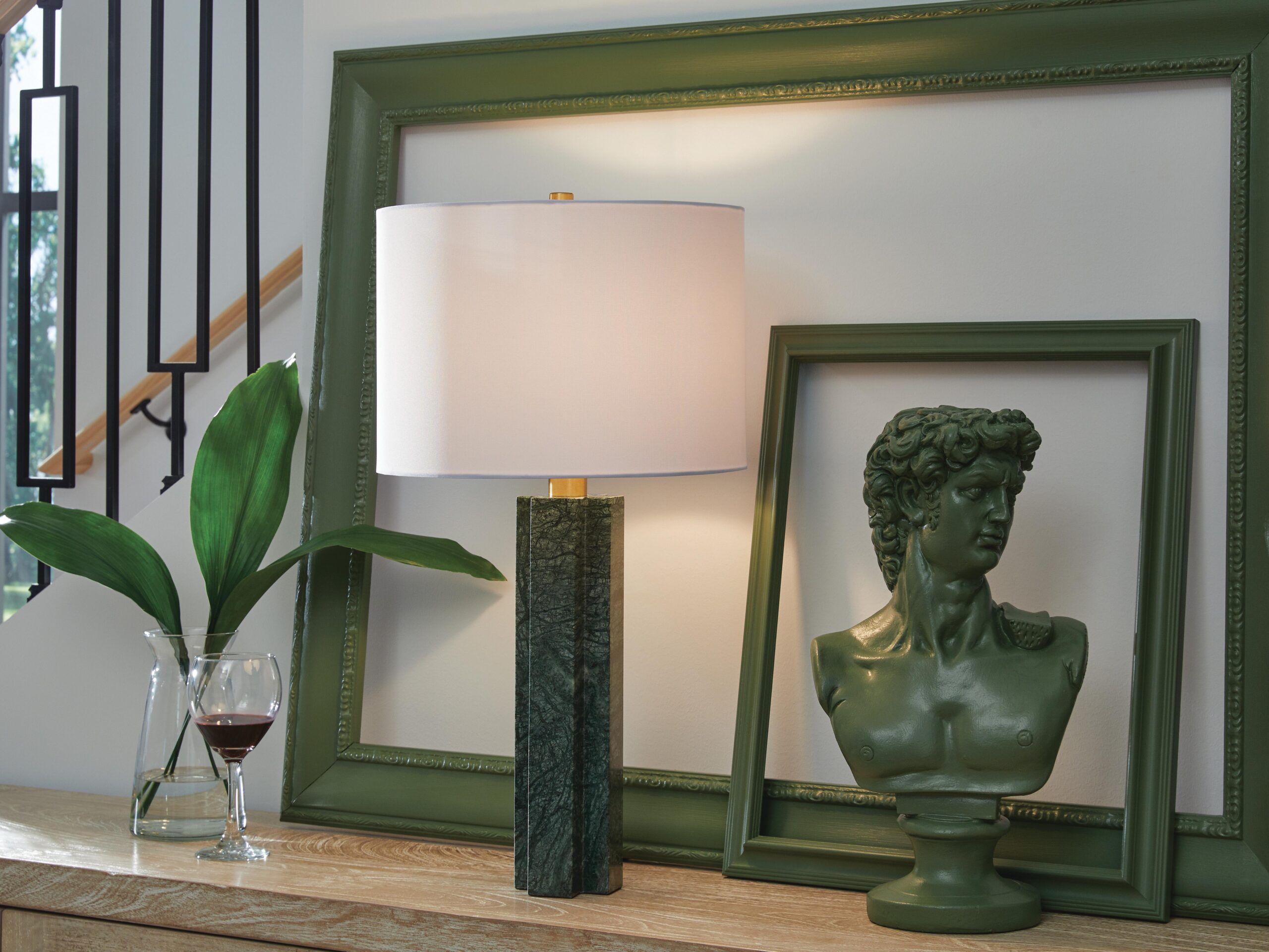 This table lamp is a master class in understated sophistication. Its sleekly dimensional base, crafted from rich green marble with subtle goldtone metal accents, adds a quietly exquisite touch to your favorite space. The statement-making lamp is a welcome addition wherever refined taste reigns supreme.