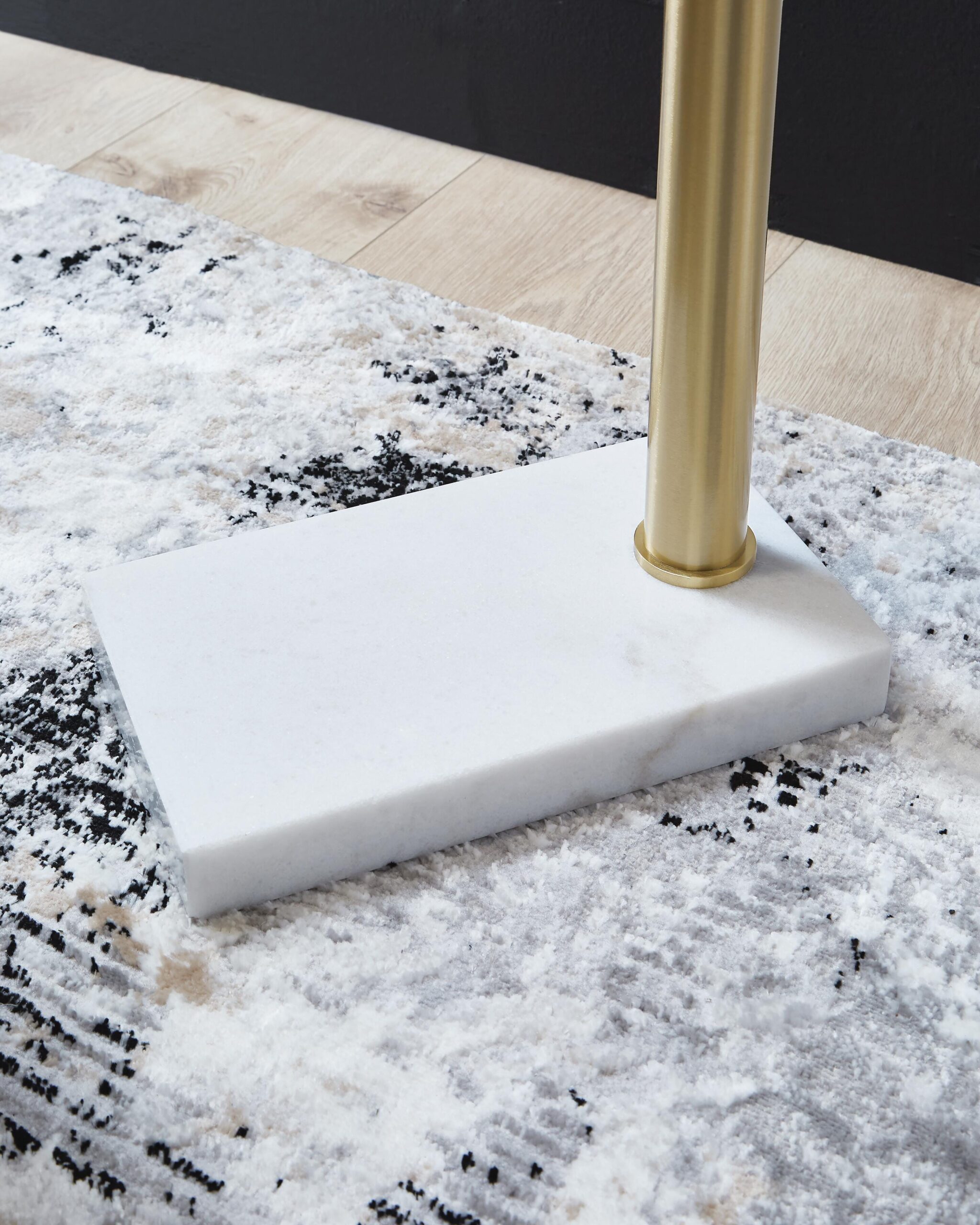 Clean-lined and contemporary, this floor lamp instantly elevates your decor. Its angular silhouette stands tall, expertly illuminating a living room or office. A gleaming goldtone finish on metal is complemented with a beautiful white marble base. And with a dimmer-style switch, you can effortlessly adjust the lighting to match your desired vibe.