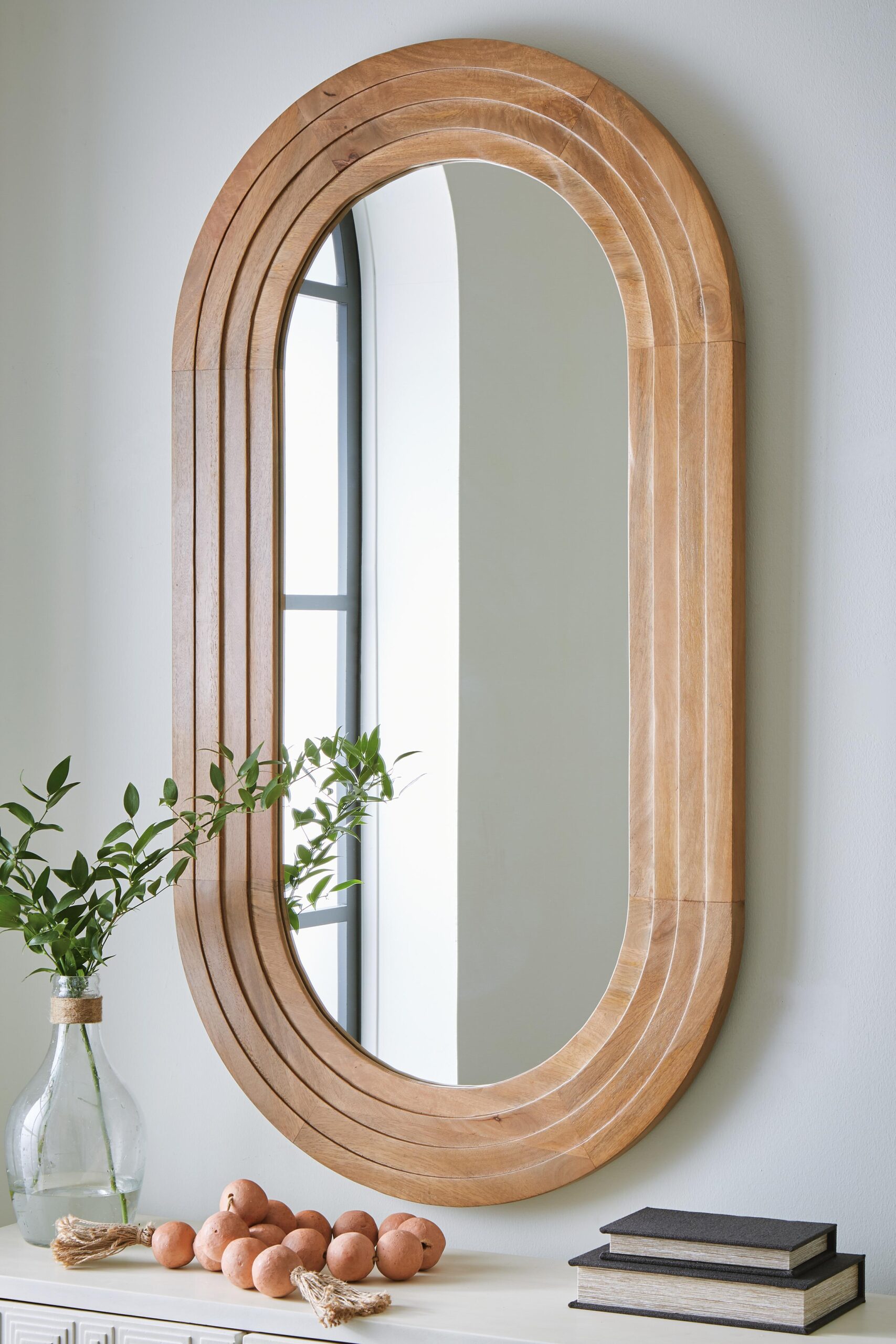 Framed with wood in a welcoming light brown finish, this accent mirror is a fresh take on functionality and style. Chic as a standalone accent in a bedroom or above a console in the entryway, it also brings light and visual variation to a gallery wall. And the ability to hang the mirror horizontally or vertically gives you additional versatility for staging.