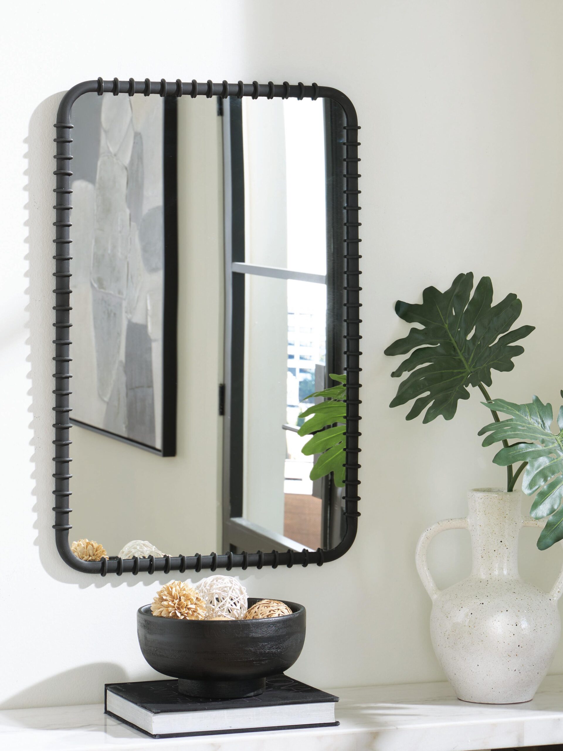 This accent mirror’s sleek black finish and ribbed design add a touch of contemporary chic to any room. Its versatile hanging options allow you to display it vertically or horizontally, making it easy to complement your existing decor. The clean lines and simple shape create a modern and minimalist feel, while the substantial frame adds a touch of boldness.