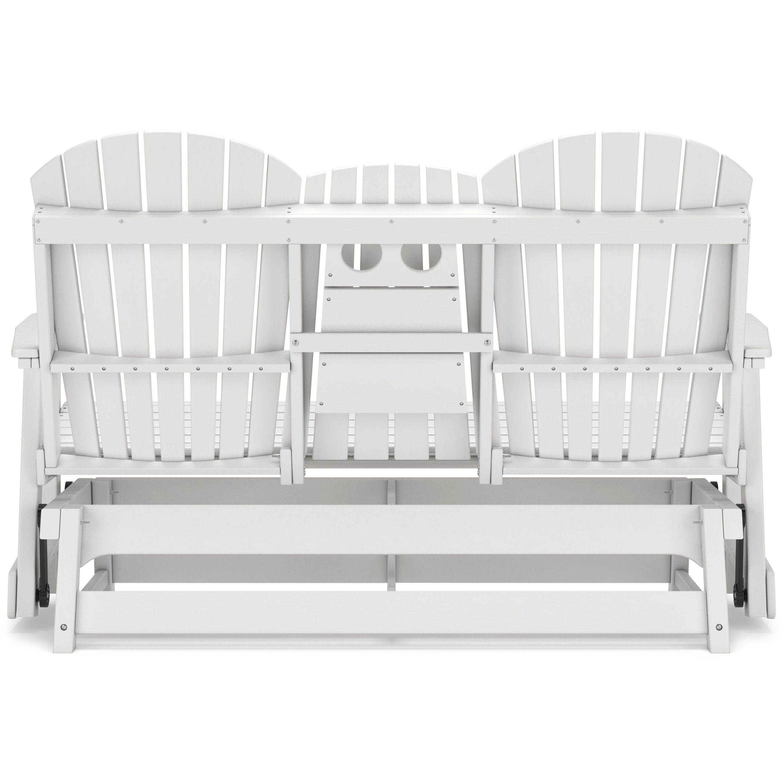 Drift away from everyday worries and into outdoor bliss with this glider loveseat. Dressed in a crisp white, the Adirondack-inspired design has a classic feel. It weathers sunny summer days and cozy winter nights with durable MEGA-TUFFĀ® HDPE material. A drop-down console with integrated cup holders keeps refreshments and snacks within easy reach. With the console snapped into the back, this loveseat has even more room for enjoying lazy days in the shade.